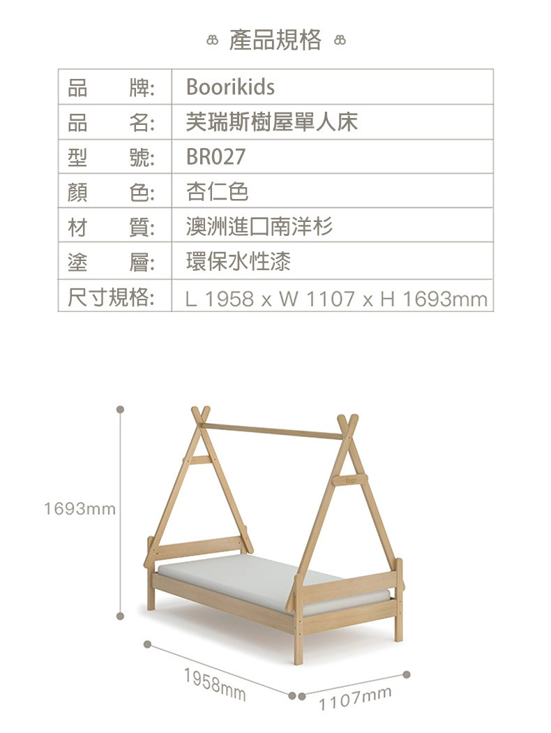 ※注意※ 因產品在生產完成後即封箱,避免有灰塵與水氣包入箱中導致木材發霉或變質的狀況。 因此開箱後可能會有新木板的氣味,此為無毒安全的環保水性漆所致,為正常的狀況。 如比較擔心的爸爸媽媽,建議可以在產品安裝完成後,放置3-5天,讓味道逐漸消散後,再做使用。 產品編號:BR27 產地:中國 尺寸:為單人3尺 商品材質:澳洲進口南洋杉 商品內容:床架本體(不包含床墊,床墊可另外進行加購;不包含床邊櫃&床底收納抽屜)